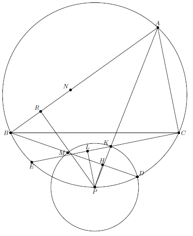 Дуга $AB$, не содержащая $C$, больше дуги $AC$, не содержащей $B$, поскольку $AB > AC$ по условию. Меньшая дуга $BP$ равна меньшей дуге $CP$, поскольку $AP$ – биссектриса. Следовательно, дуга $ACP$ меньше $180^{\circ}$, и точка $K$ принадлежит хорде $EC$, где $E$ – точка, диаметрально противоположная точке $A$. Из этого следует также, что $PK < PC$ и, значит, точка $D$ лежит на меньшей дуге $PC$.
