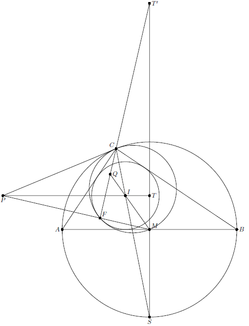 Пусть $S$ – середина дуги $AB$ описанной окружности, $T$ – проекция $M$ на прямую $PI$, $T'$ – образ $T$ при инверсии относительно описанной окружности. Так как точки $T$ и $C$ лежат на окружности с диаметром $MP$, $T'$ лежит на образе этой окружности – прямой $CH$. Заметим, что точки $T'$, $C$, $Q$ лежат на прямых $MS$, $SI$, $MI$ соответственно, причем $\frac{T'M}{T'S}=\frac{R^2/r}{R^2/r+R}=\frac{R}{R+r}$, $\frac{CS}{CI}=\frac{R+r}{r}$ (поскольку $SI=SA=SB=R\sqrt{2}$), $\frac{QI}{QM}=\frac{r}{R}$. По теореме Менелая $Q$, $T'$, $C$ лежат на одной прямой.