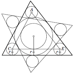 Обозначим радиусы шести равных окружностей через $r$, а их центры – через $A, B, C, D, E, F$ в порядке обхода против часовой стрелки. Рассмотрим треугольник $ACE$. Заметим, что если уменьшить на $r$ радиус вписанной окружности исходного треугольника, содержащего треугольник $ACE$, оставив центр тем же, то получится вписанная окружность треугольника $ACE$ (см. рис.).