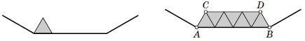 Если это треугольник (см. рис. ниже слева), то несложно видеть, что все оставшиеся фигуры разбиения, которые примыкают к этой стороне, – тоже треугольники, потому что образующиеся углы 120° можно замостить только двумя треугольниками (см. рис. ниже справа). Таким образом, к каждой стороне многоугольника $M$ примыкают либо только квадраты, либо только треугольники.