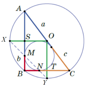 Пусть $ABC$ – тр-к с прямым углом $B, O$ – центр его описанной окружности, $M$ и $N$ – точки касания вписанной окружности с катетами $AB$ и $ВC$ соответственно, $X$ и $Y$ – середины дуг $AB$ и $BC$. Достаточно доказать, что точки $M$ и $N$ лежат на хорде $XY$. Способ 1. Перпендикуляры $OS$ и $OT$, опущенные на катеты $AB$ и $BC$, пересекают описанную окружность в точках $X$ и $Y$ соответственно (см. рис.). Обозначим длины касательных из точек $A, B, C$ к вписанной окружности через $a, b, c$. Треугольник $XOY$ равнобедренный прямоугольный. Заметим, что $XS = OX – OS = \frac{a+c}{2} – \frac{b+c}{2} = \frac{a-b}{2}$. Если $M'$ – точка пересечения $XY$ с $AB$, то $SM' = SK = \frac{a-b}{2}$, откуда $SM' + MB = SK + MB = \frac{a-b}{2} + b = \frac{a+b}{2} = BS$, а значит, $M'$ и $M$ совпадают. Аналогично $XY$ пересекает $BC$ в точке $N$.