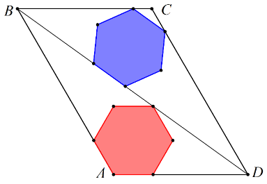 Параллелограмм $ABCD$ разделён диагональю $BD$ на два равных треугольника. В треугольник $ABD$ вписан правильный шестиугольник так, что две его соседние стороны лежат на $AB$ и $AD$, а одна из вершин – на $BD$. В треугольник $CBD$ вписан правильный шестиугольник так, что две его соседние вершины лежат на $CB$ и $CD$, а одна из сторон – на $BD$. Какой из шестиугольников больше?