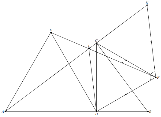 Из условия следует, что $FD=CD$, $DE=AD$ и $\angle FDE=\angle CDA$. Следовательно, треугольники $FDE$ и $CDA$ равны и $\angle FLC=60^{\circ}$. Отложим на луче $LC$ отрезок $LK=LF$. Так как треугольник $LFK$ равносторонний, то $FK=FL$ и $\angle KFL=\angle CFD=60^{\circ}$. Следовательно, $\angle KFC=\angle DFL$, т.е. треугольники $KFC$ и $LFD$ равны. Таким образом, $KC=LD$, что равносильно утверждению задачи.
