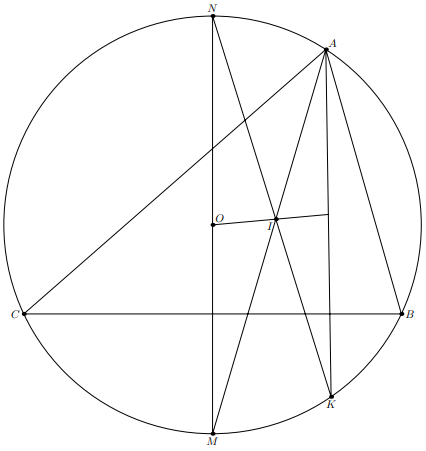Пусть $M$, $N$ – середины дуг $BC$ и $ABC$ описанной окружности треугольника $ABC$. Известно, что точка $K$ касания описанной и полувписанной окружностей лежит на прямой $NI$. Кроме того, точка $I$ лежит на прямой $AM$ (см. рис.). Значит, треугольники $IMN$ и $IKA$ подобны, а медиана $OI$ треугольника $IMN$ совпадает с симедианой треугольника $IKA$.