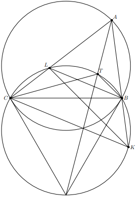 Заметим, что прямая $AT$ проходит через вершину правильного треугольника с основанием $BC$. Поскольку $\angle A=60^{\circ}$, эта вершина является точкой пересечения касательных к описанной окружности треугольника $ABC$ в точках $B$ и $C$, т.е. $AT$ – симедиана треугольника. С другой стороны, легко видеть, что треугольники $ABL$ и $ACK$ правильные, т.е. треугольники $ABC$ и $ALK$ симметричны относительно биссектрисы угла $A$ и $AT$ – медиана треугольника $AKL$.