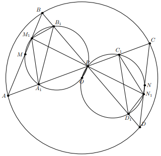 Четырёхугольник $ABCD$ вписан в окружность с центром $O$. Пусть $P$ – точка пересечения его диагоналей, а точки $M$ и $N$ – середины сторон $AB$ и $CD$ соответственно. Окружность $OPM$ вторично пересекает отрезки $AP$ и $BP$ в точках $A_1$ и $B_1$ соответственно, а окружность $OPN$ вторично пересекает отрезки $CP$ и $DP$ в точках $C_1$ и $D_1$ соответственно. Докажите, что площади четырёхугольников $AA_1B_1B$ и $CC_1D_1D$ равны.