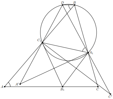 Из условия следует, что $\angle A'C_1B_1=\angle A_1C_1B_1= \frac{1}{2}(180^{\circ}-\angle C)$, следовательно, $\angle DC_1A_1=\angle C$. Аналогично получаем, что $\angle DA_1C_1=\angle A$. Тогда $\angle C_1DA_1=\angle B$. Значит, четырехугольник $A_1BDC_1$ вписанный и $\angle DBA=\angle DA_1C_1=\angle BAC$, откуда следует утверждение задачи.