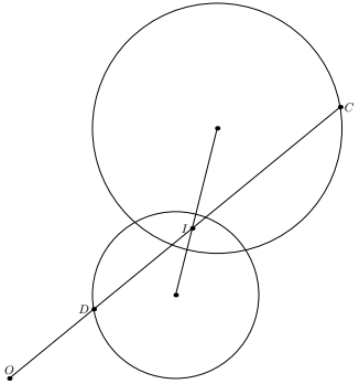 Рассмотрим гомотетию с центром $O$ и коэффициентом $OC:OD$. Она переводит вторую окружность $\omega_2$ в некоторую окружность $\omega$, проходящую через $C$. Если отношение $OC:OD$ максимально, то никакая окружность, гомотетичная $\omega$ с центром $O$ и коэффициентом, большим 1, не пересекает первую окружность $\omega_1$. Следовательно, $\omega$ касается $\omega_1$ в точке $C$, т.е. касательные к $\omega_1$ и $\omega_2$ в точках $C$ и $D$ соответственно параллельны и прямая $CD$ проходит через центр $I$ внутренней гомотетии этих окружностей. Отсюда получаем искомое построение: точка $C$ является дальней от $O$ точкой пересечения $\omega_1$ и прямой $OI$, а $D$ – ближней к $O$ точкой пересечения $OI$ с $\omega_2$.