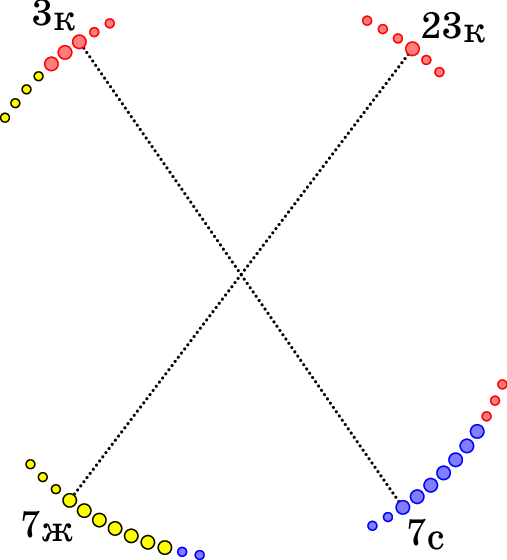 Сто сидений карусели расположены по кругу через равные промежутки. Каждое покрашено в жёлтый, синий или красный цвет. Сиденья одного и того же цвета расположены подряд и пронумерованы 1, 2, 3, ... по часовой стрелке. Синее сиденье № 7 противоположно красному № 3, а жёлтое № 7 — красному № 23. Найдите, сколько на карусели жёлтых сидений, сколько синих и сколько красных.