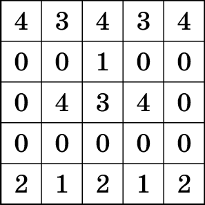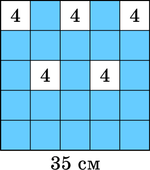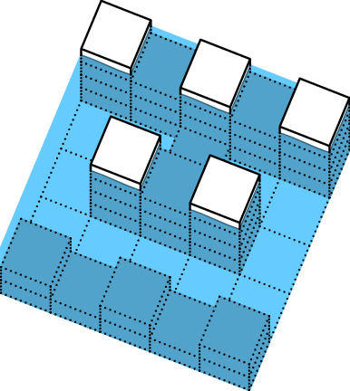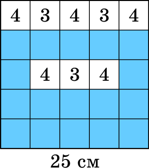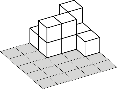 Посреди пустого бассейна стоит квадратная платформа 50 × 50 сантиметров, расчерченная на клеточки 10× 10 см. На клетки платформы Лена ставит башенки из кубиков 10× 10× 10 см. Потом Таня включает воду. Если высоты башенок были такие, как в таблице справа, то при уровне воды 5 см был 1 остров, при уровне воды 15 см было два острова (если острова «граничат по углу», то считаются отдельными островами), а при уровне воды 25 см все башенки оказались закрыты водой и стало 0 островов.
