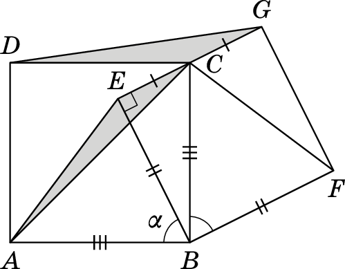 Решение 1:Перенесём чертёж на клетчатую бумагу. Начнём с квадратаBEGF: пусть это клетчатый квадрат 2×2. По отрезкуBCпостроим квадратABCD. Теперь видно, что отрезкиDGиDBравны как гипотенузы прямоугольных треугольников с катетами длиной 1 клетка и 3 клетки.