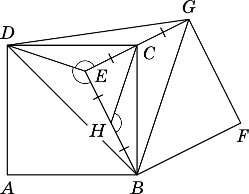 Решение 3:Рассмотрим треугольникиDEGиDEB. У них общая сторонаDE, равные стороныEGиEB(как две стороны квадрата). Осталось доказать, что углыDEGиDEBравны, — тогда указанные треугольники будут равны (по двум сторонам и углу между ними), а значит, будут равны и соответственные стороныDGиDB. Равенство этих углов можно доказать так. Отметим H — середину отрезка EB. Заметим, что HB = EC как половины стороны правого квадрата, а также BC = DC, ∠HBC = 90° - ∠ECB = ∠ECD. Значит, треугольники HBC и ECD равны по двум сторонам и углу между ними. Так как треугольник EHC равнобедренный прямоугольный, ∠EHC = 45°, а ∠DEG = ∠CHB = 180° - ∠EHC = 135°. Но тогда и ∠DEB = 360° - ∠DEG - ∠GEB = 360° - 135° - 90° = 135°.