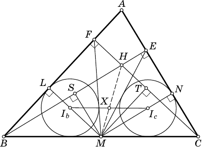 Решение 2:Как и в первом решении, обозначим окружности, вписанные в треугольники $BMF$ и $CME$, через $\omega_{1},\omega_{2}$, их центры через $I_b$ и $I_c$ соответственно, а середины отрезков $BF$ и $CE$ — через $L$ и $N$. Пусть также $Y$ — точка пересечения внешних касательных к $\omega_{1},\omega_{2}$. Заметим, что четвёрка точек $(I_b,I_c,X,Y)$ — гармоническая, то есть двойное отношение $(I_b,I_c;X,Y)$ равно $-1$. Спроецируем эту четвёрку точек на прямую $BE$ с центром в точке $M$. Точка $Y$ лежит на прямой $BC$, поскольку эта прямая является одной из внешних касательных к $\omega_{1}$ и $\omega_{2}$, поэтому $Y$ перейдёт в $B$. Точка $I_b$ перейдёт в точку $R$ пересечения прямых $ML$ и $BH$, которая является серединой $BH$, поскольку в треугольнике $BFC$ отрезок $ML$ — средняя линия. Точка $I_c$ перейдёт в бесконечно удалённую точку прямой $BH$, поскольку $MI_c \parallel BH$. Но при центральной проекции сохраняется двойное отношение четвёрки точек, а четвёрка $(R,\infty,H,B)$ — гармоническая. Значит, образом точки $X$ при данной проекции является точка $H$, что и требовалось доказать.