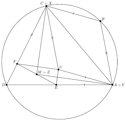 Решение 1:Построим параллелограмм $ABCU$. Точки $E$, $F$ симметричны $U$ относительно биссектрис углов $BAD$, $BCD$ соответственно. Поскольку $\angle AUC+\angle ADC=180^{\circ}$, эти биссектрисы перпендикулярны. Следовательно, треугольник $UEF$ прямоугольный, а биссектрисы пересекаются в центре описанной около него окружности – точке $M$.