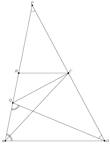 Продлим боковые стороны трапеции до пересечения в точке $P$, также пересечём серединный перпендикуляр к $PD$ с $AP$ в точке $Q$. Тогда $\angle AQD=2\angle QPD=\angle QAD$ и $AD=QD>CD$ (гипотенуза прямоугольного треугольника больше катета). Значит, $\angle ACD>\angle CAD=\angle BCA$.