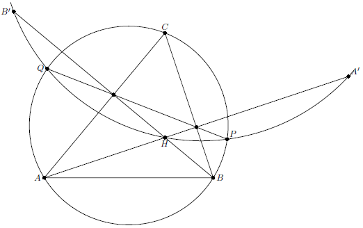 Поскольку точки, симметричные ортоцентру относительно сторон треугольника, лежат на описанной окружности, то $H_AH\cdot H_AA'=H_AB\cdot H_AC=H_AP\cdot H_AQ$, следовательно, точки $P$, $Q$, $H$, $A'$ лежат на одной окружности. Аналогично $P$, $Q$, $H$, $B'$ лежат на одной окружности.