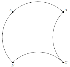 Возьмем квадрат $ABCD$ и заменим стороны $AB$, $AD$ равными дугами, направленными наружу, а стороны $BC$, $CD$ такими же дугами, направленными внутрь. Получим фигуру, ограниченную четырьмя дугами, которой, очевидно, можно замостить плоскость. Также можно замостить плоскость полоской из $k$ таких фигур, которая ограничена $2k+2$ дугами. Кроме того, можно выбрать радиусы дуг так, чтобы дуги $AB$ и $AD$ составили одну полуокружность.