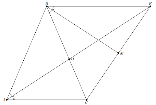 На боковой стороне $BC$ равнобедренного треугольника $ABC$ выбрана точка $D$. Луч $AD$ пересекает прямую, проходящую через вершину $B$ и параллельную основанию $AC$, в точке $E$. Докажите, что касательная к описанной окружности треугольника $ABD$ в точке $B$ делит отрезок $EC$ пополам.