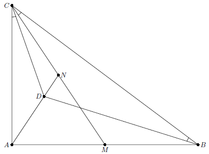 Пусть точка $M$ – середина катета $AB$ прямоугольного треугольника $ABC$ с прямым углом $A$. На медиане $AN$ треугольника $AMC$ отмечена точка $D$, так что углы $ACD$ и $BCM$ равны. Докажите, что угол $DBC$ также равен этим углам.