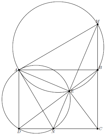 Решение 2:Пусть $\omega_1$, $\omega_2$ – окружности, описанные около треугольников $AEB$, $AED$ соответственно, $R_1$ и $R_2$ – радиусы $\omega_1$ и $\omega_2$, а $X$ – центр их внешней гомотетии. Тогда $$ \operatorname{deg}(X,\omega_1):\operatorname{deg}(X,\omega_2)=R_1^2:R_2^2. \quad (1) $$ Пусть прямые $CB$ и $CD$ повторно пересекают $\omega_1$ и $\omega_2$ соответственно в точках $M$ и $N$. Очевидно, $AN$ и $AM$ – диаметры $\omega_1$ и $\omega_2$, кроме того, треугольник $AND$ подобен треугольнику $AMB$, а треугольник $AMN$ – треугольнику $ABD$. Поэтому $$ \frac{R_1}{R_2}=\frac{AM}{AN}=\frac{CD}{CB}, \quad(2) $$ С другой стороны $$ \frac{CM}{CN}=\frac{\sin\angle ENC}{\sin\angle EMC}=\frac{\sin\angle EAD}{\sin\angle EAB}=\frac{ED}{EB}\frac{AB}{AD}=\frac{CD^3}{CB^3}. $$ Cледовательно, $$ \frac{\operatorname{deg}(C,\omega_1)}{\operatorname{deg}(C,\omega_2)} = \frac{CB\cdot CM}{CD\cdot CN} = \frac{R_1^2}{R_2^2}. \quad(3) $$