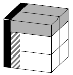 Миша сложил из восьми брусков куб (см. рис.). Все бруски имеют один и тот же объём, серые бруски одинаковые и белые бруски тоже одинаковые. Какую часть ребра куба составляют длина, ширина и высота белого бруска?
