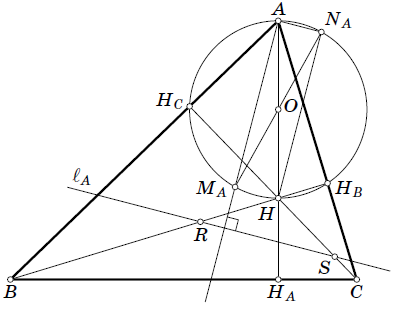 Пусть $R$ и $S$ – это точки пересечения окружности с центром в $H$ радиуса $HH_A$ с отрезками $BH$ и $CH$ соответственно. Тогда треугольник $RHS$ – равнобедренный с основанием $RS$, поэтому прямая $RS$ (она же $\ell_A$) перпендикулярна прямой $p_A$, содержащей биссектрису угла $BHC$. Поэтому достаточно доказать, что прямая $p_A$ параллельна биссектрисе угла $BAC$. Пусть $M_A$ и $N_A$ – середины дуг ${H_CHH_B}$ и ${H_BAH_C}$ окружности $\omega_A$, построенной на $AH$ как на диаметре. Из свойств вписанных углов следует, что $AM_A$ – биссектриса угла $BAC$, $HN_A$ – биссектриса угла $H_CHH_B$. Заметим также, что $M_AN_A$ – диаметр окружности $\omega_A$. Значит, отрезки $M_AN_A$ и $AH$ пересекаются в центре $O$ окружности $\omega_A$ как её диаметры и делятся точкой пересечения пополам. То есть четырёхугольник $AM_AHN_A$ – параллелограмм (и даже прямоугольник, поскольку его углы – вписанные, опирающиеся на диаметры окружности $\omega_A$, то есть прямые). В частности, $AM_A\parallel HN_A$, что и требовалось.