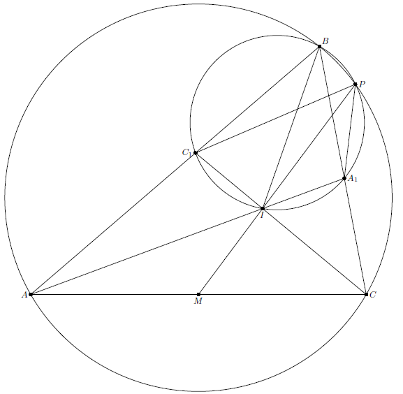Биссектрисы $AA_1$, $CC_1$ треугольника $ABC$, в котором $\angle B=60^{\circ}$, пересекаются в точке $I$. Описанные окружности треугольников $ABC$, $A_1IC_1$ пересекаются в точке $P$. Докажите, что прямая $PI$ проходит через середину стороны $AC$.