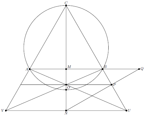 Пусть $M$ – середина $AB$, $N$ – точка, симметричная $M$ относительно $O$, $P$ – точка пересечения $PN$ и $BC$, $U$, $V$ – точки пересечения прямой, проходящей через $N$ и параллельной $AB$, с прямыми $BC$, $AC$ соответственно.