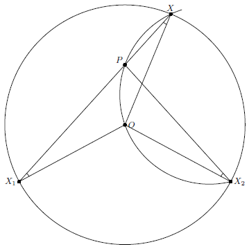 Из вписанного четырехугольника $XPOX_2$ и равнобедренного треугольника $XOX_1$ получаем $\angle PX_2O=\angle PXO=\angle PX_1O$. А поскольку $OX_1=OX_2$, то $\angle PX_1X_2=\angle PX_2X_1$ и $PX_1=PX_2$. Таким образом, $PO$ – серединный перпендикуляр ко всем отрезкам $X_1X_2$, т.е все эти отрезки параллельны.