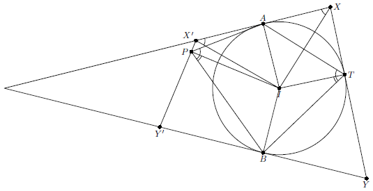 Аналогично показывается, что по любой точке $P$ полученной окружности можно построить точки $X$, $Y$, причем прямая $XY$ будет касаться $\omega$. Исключением являются только две точки, для которых прямая $IP$ перпендикулярна одной из сторон угла, так как в этих случаях одна из точек $X'$, $Y'$ не существует.