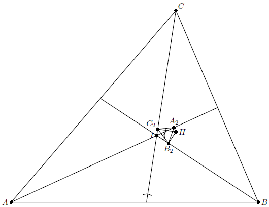 Точки $A_2$, $B_2$, $C_2$ являются проекциями ортоцентра на биссектрисы и, значит, лежат на окружности с диаметром $HI$, где $I$ – центр вписанной окружности. Поэтому, например, $\angle A_2C_2B_2=\angle A_2IB_2=(\angle A+\angle B)/2=\angle A_1C_1B_1$. Равенство остальных углов треугольников $A_1B_1C_1$ и $A_2B_2C_2$ доказывается аналогично.
