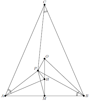 В равнобедренном треугольнике $ABC$ ($AC=BC$) $O$ – центр описанной окружности, $H$ – ортоцентр, $P$ – такая точка внутри треугольника, что $\angle APH=\angle BPO=\pi/2$. Докажите, что $\angle PAC=\angle PBA=\angle PCB$.