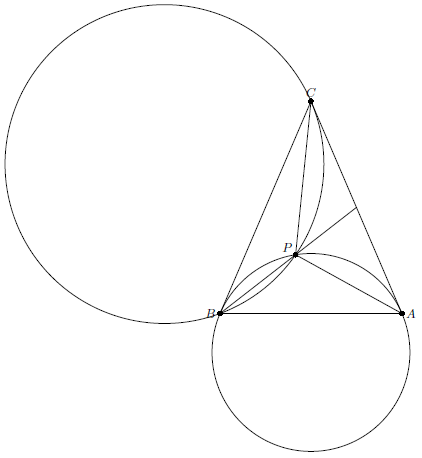 Пусть $P$ лежит на медиане из вершины $B$. Тогда $AC$ касается окружности $CPB$, а значит, и окружности $APB$, потому что медиана является их радикальной осью. С другой стороны, окружность $APB$ касается стороны $BC$, следовательно, $AC=BC$ и точка $Q$, симметричная $P$ относительно оси симметрии треугольника удовлетворяет условию.