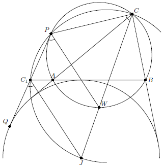 Лемма. Пусть $J$ – центр вневписанной окружности, $P$ – точка касания прямой $A_1B_1C_1$ с описанной окружностью. Тогда точки $C$, $J$, $C_1$, $P$ лежат на одной окружности. Доказательство. Пусть $W$ – вторая точка пересечения прямой $CJ$ с описанной окружностью. Тогда $UW\parallel C_1J$ и $\angle(PC,CJ)=\angle(PC_1,C_1J)$.