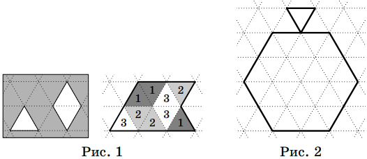 фигуру в форме яблока (на рисунке справа) в 5 цветов так, чтобы каждая треугольная клетка была покрашена ровно одним цветом. Трафарет можно поворачивать и переворачивать.