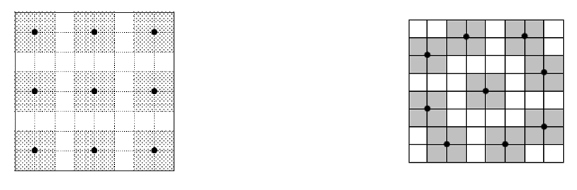 Пусть ворона утащит ягоды, отмеченные точками на рисунке слева. Участок, содержащий одну из этих ягод внутри себя, должен содержать и квадрат 2×2 с центром в этой точке. Поэтому никакие две утащенные вороной ягоды не могут лежать внутри одного участка – ведь участок имеет площадь 8 клеток и состоял бы тогда ровно из двух таких квадратов, а они не образуют многоугольник.