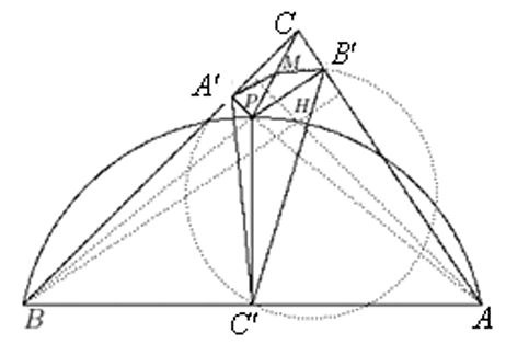 откуда $\angle A'MB' + \angle A'C'B'$ = 180°, то есть точки $A', M, B', C'$ лежат на одной окружности, что и требовалось.
