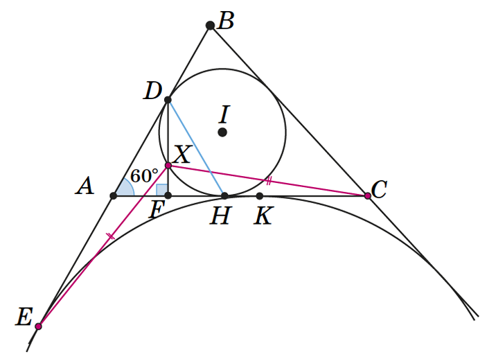 Пусть вписанная окружность $\omega$ с центром $I$ касается стороны $AC$ в точке $H$, вневписанная окружность из условия касается стороны $AC$ в точке $K$, перпендикуляр $DF$ из условия пересекает $\omega$ в точке $X$. Поскольку $AD = AH$, $\angle A = 60^\circ$, то треугольник $ADH$ равносторонний, а $DF$ – его высота. Так как $\angle XIH = 2\angle XDH = 60^\circ = \angle AIH$, точка $X$ лежит на прямой $AI$, то есть является центром треугольника $ADH$. По свойствам касательных вписанной и вневписанной окружностям, $AE = AK = CH$. Кроме того, $AX = HX$, $\angle EAX = 150^\circ = \angle CHX$. Следовательно, треугольники $AXE$ и $HXC$ равны, откуда $XE = XC$.