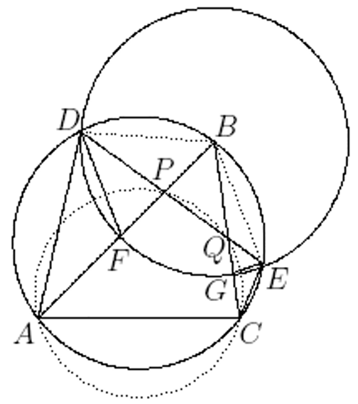 Но тогда равны углы $EAB$ и $DAB$, и для угла $\angle BPQ$, как для угла между хордами $DE$ и $AB$, мы получаем равенство: $$\angle BPQ = \angle EAB + \angle DBA = \angle DAB + \angle DBA = 180^\circ – \angle ADB = \angle ACB,$$ откуда четырёхугольник $APQC$ вписанный.