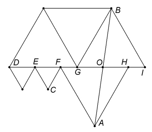 Решение 2:Обозначим точки как показано на рисунке. Пусть $m$ – длина стороны малого треугольника, $b$ — большого. Равносторонние треугольники с вершинами $A$ и $B$ центрально симметричны. Значит, $O$ – центр их симметрии. Поэтому $AO = OB$, $GO =OH =m$ и $EO=b$. Треугольники $CEO, CFA$ и $OHA$ равны, так как у них есть стороны $m$ и $b$ с углом 60° между ними. Следовательно, $CO = CA = OA$ и треугольник $ABC$ прямоугольный с углом $A = 60^\circ$.