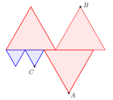 Пять равносторонних треугольников расположены так, как показано на рисунке ниже. Три больших треугольника равны между собой и два маленьких тоже равны между собой. Найдите углы треугольника $ABC$.