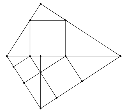 Решение 2.Отразим прямоугольный треугольник относительно гипотенузы, один из треугольников разобьём высотой на два, впишем в них квадраты (см. рисунок). Поскольку треугольники подобны, то вершины квадратов разбивают катеты в одном и том же отношении, поэтому совпадения вершин квадратов не случайны. Тогда по теореме Пифагора для треугольника, заключённого между квадратами, сумма площадей малых квадратов равна площади большого. Дважды заменяя в задаче пару малых квадратов на один вписанный той же площади, оставим только два квадрата, вписанные в равные треугольники. Значит, спрашиваемые в задаче площади равны.