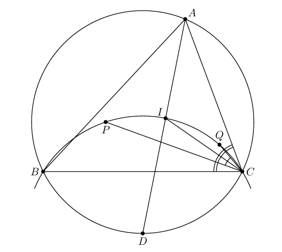 Решение 1:Пусть $I$ – точка пересечения отрезка $AD$ и дуги $BPQC$. Так как $DB = DC$, то $AD$ – биссектриса угла $BAC$ и по теореме о трилистнике $I$ – центр вписанной в треугольник $ABC$ окружности. Следовательно, $CI$ – биссектриса угла $ACB$. С другой стороны, так как $AD$ – серединный перпендикуляр к $PQ$, то $PI = QI$, то есть $CI$ – биссектриса угла $PCQ$. Из этих двух утверждений, очевидно, следует утверждение задачи.