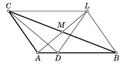 Решение 1:Продлим медиану $AM$ на её длину до точки $L$ ($AM=ML$). Тогда $ACLB$ – параллелограмм, $ACLD$ – трапеция. Поскольку её диагонали $AL$ и $CD$ равны, она равнобокая, откуда $LD=CA=LB$, то есть угол $LBD$ острый как угол при основании равнобедренного $\triangle LBD$, а дающий в сумме с ним $180^\circ$ угол $CAB$ тупой.