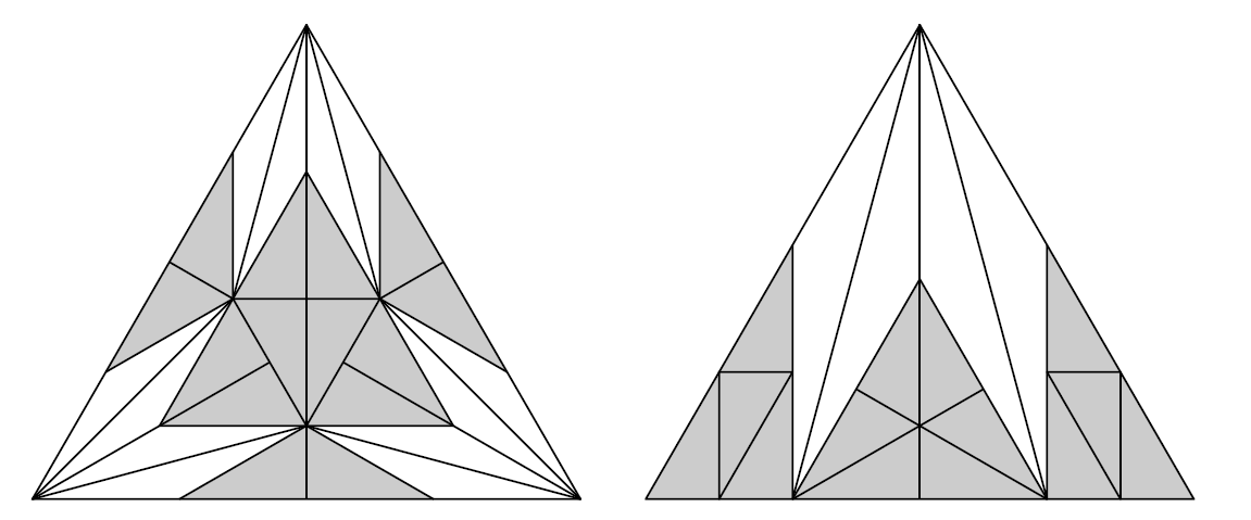 В первом примере на рисунке слева все 12 равнобедренных треугольников имеют углы 15, 15 и 150 градусов, а все 14 прямоугольных – 90, 60 и 30 градусов.