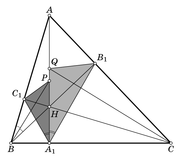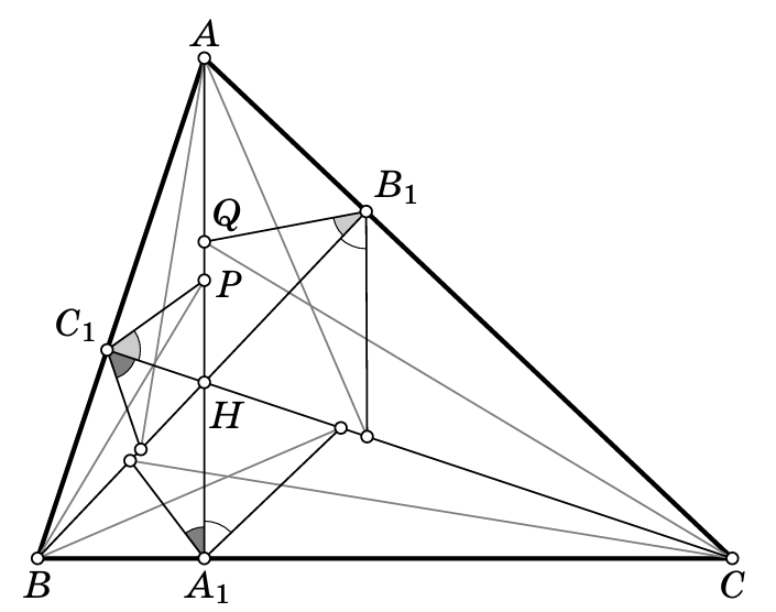 Воспользуемся ещё одним известным фактом: высота $AA_1$ – биссектриса угла $B_1A_1C_1$. Из того, что $\angle C_1A_1P = \angle B_1A_1Q$, получаем, что треугольники $PC_1A_1$ и $B_1QA_1$ подобны по углу и отношению прилежащих сторон, откуда $\angle A_1C_1P = \angle A_1QB_1$.