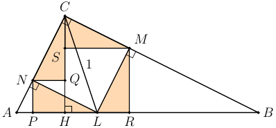 Опустим теперь перпендикуляры из точек $N$ и $M$ на $AB$ и $CH$. Закрашенные на рисунке ниже треугольники равны по гипотенузе (стороне квадрата $CMLN$) и острому углу, так как