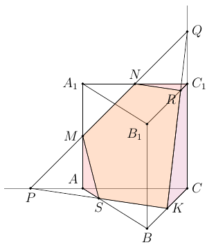Пусть $M$, $N$ и $K$ – середины рёбер одинаковой длины $AA_1$, $A_1C_1$ и $BC$. Построим сечение нашей призмы плоскостью. Для этого проведём прямую $MN$ до пересечения с продолжениями рёбер $AC$ и $CC_1$ в точках $P$ и $Q$, а затем проведём прямые $KP$ и $KQ$ (см. рисунок). Получим пятиугольное сечение $MNRKS$.