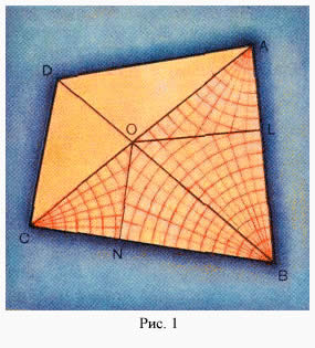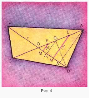 Обозначим круги с центрами A, B, C, D в вершинах данного четырехугольника ABCD через KA , KB , KC , KD , их радиусы – через rA , rB , rC , rD. Предположим, что утверждение задачи неверно. Тогда каждый круг имеет общую точку с частью противоположного ему треугольника, не покрытой тремя другими кругами: например, KA должен содержать точки Δ BCD, не покрытые ни одним из кругов KB , KC , KD. Пусть O – точка пересечения диагоналей. Докажем при нашем предположении, что rA ≥ OA , т.е. что круг KA содержит точку O . Остальное уже ясно: точно так же можно будет доказать, что точка O принадлежит KB и KC , а отсюда очевидным образом следует, что эти круги покрывают Δ ABC. Посмотрите на рис. 1, 2: если OL и ON – перпендикуляры, опущенные на прямые AB и BC, то KA покрывает Δ OAL, KC – Δ OCN, KB – Δ OBL и Δ OBN, а эти четыре прямоугольных треугольника заведомо покрывают Δ ABC, даже если один из треугольников AOB или OBC (как на рис. 2) тупоугольный. Приходим к противоречию с нашим предположением, следовательно, утверждение задачи верно. Итак, осталось доказать, что rA ≥ OA . Нам понадобится следующая, почти очевидная Лемма. Пусть задан выпуклый четырехугольник PQRS и круг KR (не содержащий Δ PQR целиком). Тогда из всех точек, лежащих внутри Δ PQR и вне KR , ближайшей к точке S будет: а) основание F перпендикуляра SF , опущенного из точки S на прямую PR , если эта точка F лежит вне круга KR (рис. 3, а); б) точка E пересечения окружности KR с отрезком PR , если точка F лежит внутри круга KR (рис. 3, б). (Здесь важно, что угол QRS четырехугольника меньше 180°; доказательство леммы оставляем читателю.) Можно считать, что Предположим, что rA<OA и E – ближайшая к O точка KA (она лежит на отрезке OA и AE=rA , EM – перпендикуляр, опущенный из E на BD . Ясно, что тогда AM>AE . Докажем, что тем не менее rA>AM , отсюда будет следовать, что наше предположение ( rA<OA ) неверно. Докажем сначала, что rB > BM . Применим лемму к Δ ACD, кругу KA и точке B. Рассмотрим два случая: а) E лежит между A и B1 . Тогда rB > BB1 > BA2 ≥ BM; б) E лежит между O и B1. Тогда (по лемме) rB > BE > BM. Итак, мы знаем, что точка M принадлежит KB. Применяя лемму к Δ BCD , кругу KB и точке A (заметим, что M лежит между O и A1, так что всегда имеет место случай б)), получим rA>AM . Круг замкнулся, требуемое противоречие получено. |