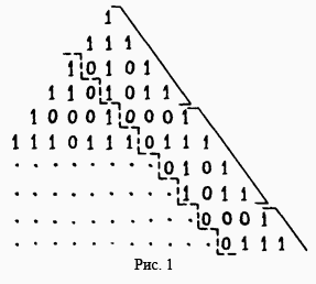 а) Будем в нашей таблице вместо чётных чисел писать 0, а вместо нечётных – 1. Тогда таблицу из нулей и единиц нужно будет составлять по тому же правилу (каждое число получается как сумма трёх, стоящих над ним в предыдущей строке), только сложение нужно выполнять по модулю два.
